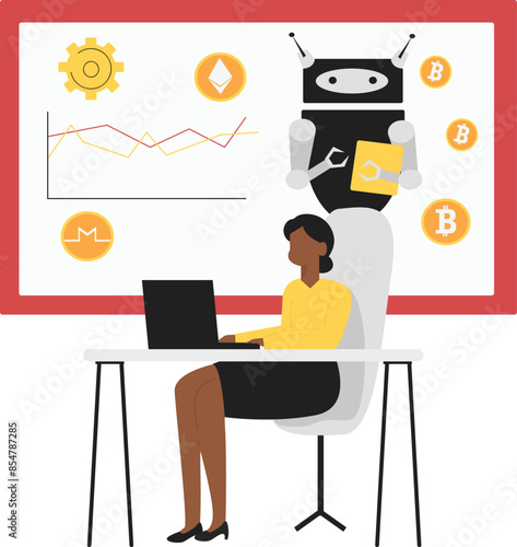 Внештатный. Молодая женщина, работающая в домашнем офисе, плоская векторная иллюстрация. Женский персонаж-фрилансер, работающий на ноутбуке на кухне. Удаленная работа, дистанционное образование, онлайн-обучение.
