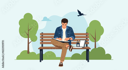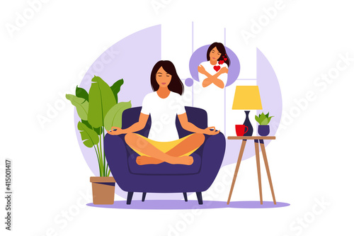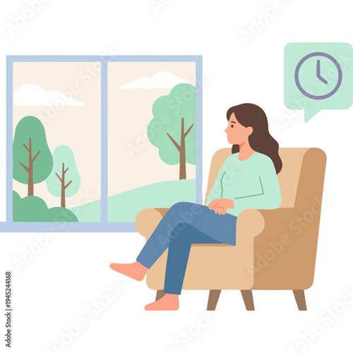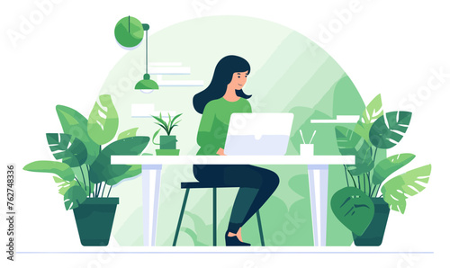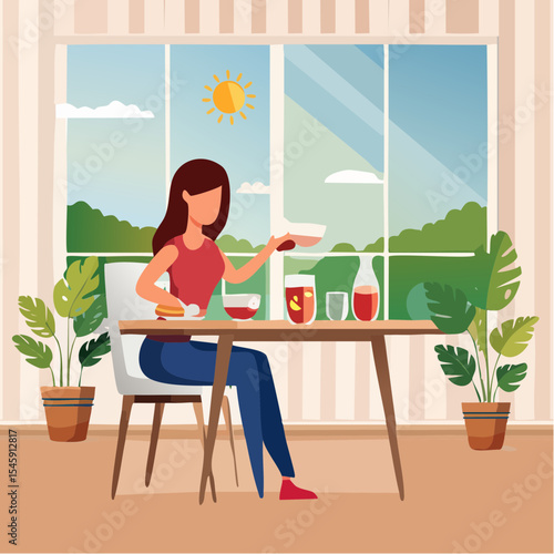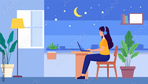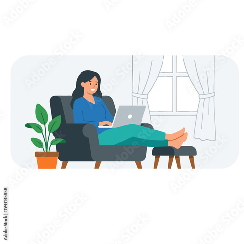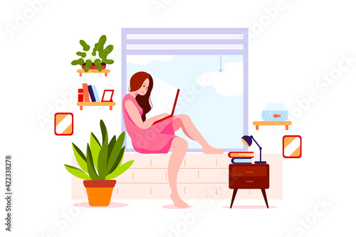 Внештатный. Молодая женщина, работающая в домашнем офисе, сидит с кошкой на подоконнике, плоская векторная иллюстрация. Женский персонаж-фрилансер, работающий на ноутбуке в гостиной. Удаленная работа, онлайн-обучение.