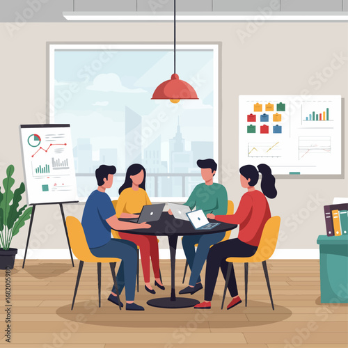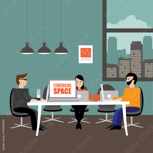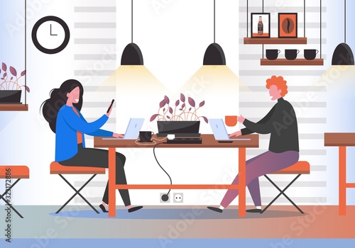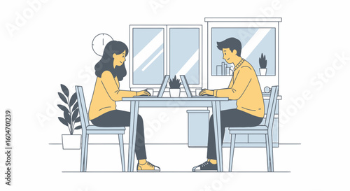 Фрилансеры мужчина и женщина, работающие на ноутбуках, сидя за столом в коворкинге, векторная иллюстрация. Концепция фрилансера для веб-баннера, страницы веб-сайта и т.д.