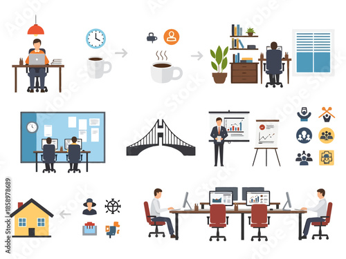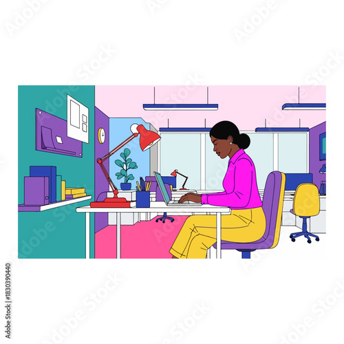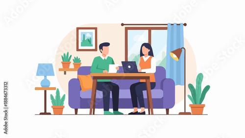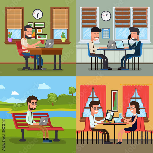 Мужские и женские персонажи-фрилансеры коворкинг-команды, работающие на ноутбуках, векторная иллюстрация дизайна в плоском стиле. Удаленная работа фрилансера, коворкинг-центр, фриланс, сайт для фрилансеров.