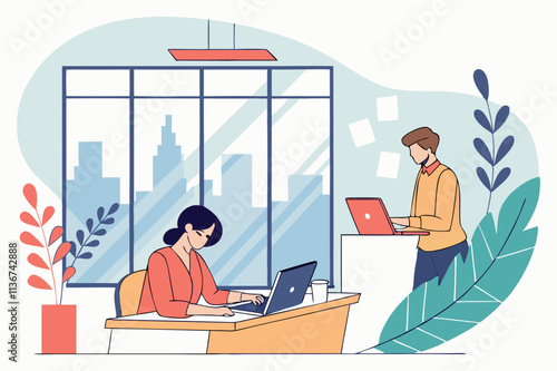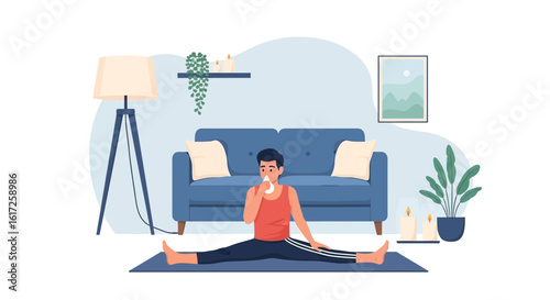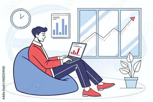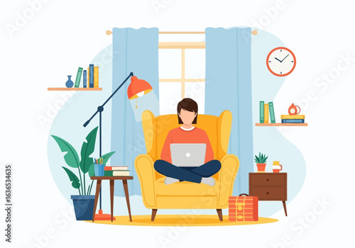 Молодой человек-фрилансер, работающий на ноутбуке дома, лежа в гамаке, векторная плоская иллюстрация. Удаленная работа, фриланс, домашнее рабочее место.