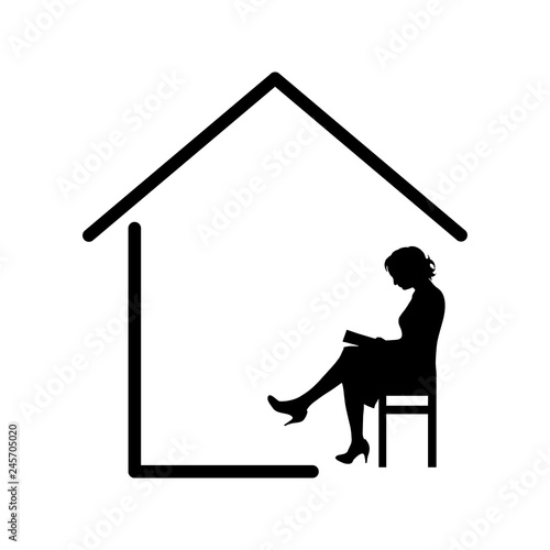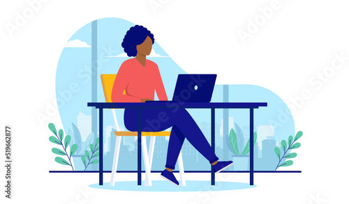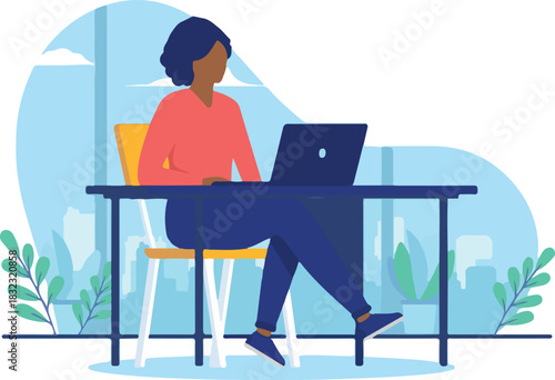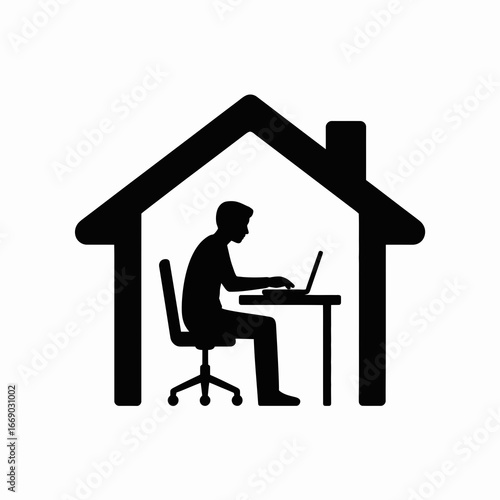 Силуэт человека-фрилансера, работающего на ноутбуке, сидящего за столом, векторная иллюстрация в стиле бумажного искусства. Домашний офис, удаленная работа, фриланс.