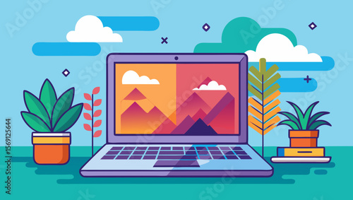 Векторная плоская иллюстрация работы фрилансера. Ноутбук, мышь, наушники, долларовые монеты, кактус, чашка чая с лимоном, зефир и ваза с цветами. Удаленная работа, домашнее рабочее место с современным оборудованием.