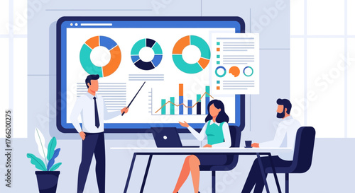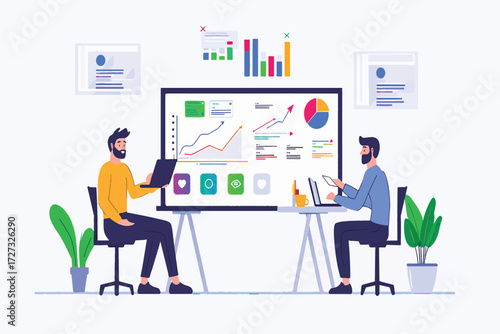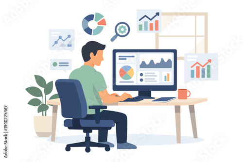 Молодой человек-фрилансер, сидящий за столом и работающий на ноутбуке в домашнем офисе, векторная плоская иллюстрация. Домашнее рабочее пространство с scrum board. Удаленная работа, концепции фриланса.