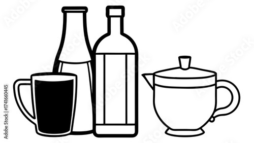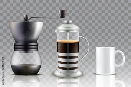 Кофеварка с френч-прессом, кофемолка и кофейная чашка. Векторная реалистичная иллюстрация, изолированная на прозрачном фоне.