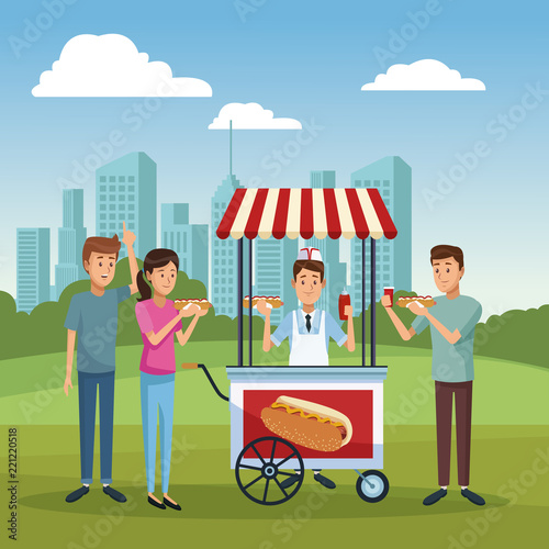 Вечеринка с барбекю в городском парке. Друзья-мужчины едят жареные сосиски, пьют пиво. Векторная иллюстрация дизайна в плоском стиле.