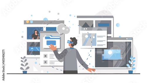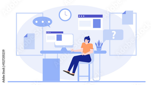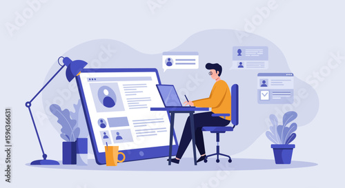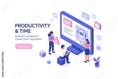 Разработка переднего плана, векторная иллюстрация дизайна в плоском стиле. Процесс разработки программного обеспечения для веб-дизайна с большим компьютером и крошечными людьми-разработчиками интерфейсов, использующими ноутбуки для веб-баннера, страницы веб-сайта.