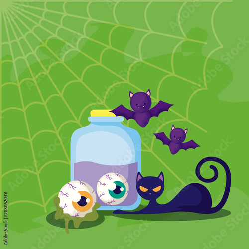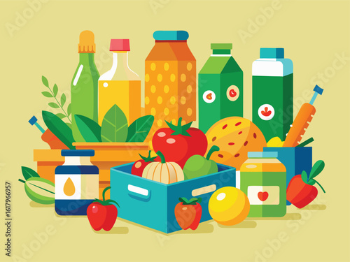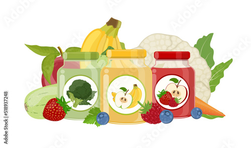 Стеклянная банка для упаковки фруктового джема, нарезанное бумагой свежее яблоко, слива, клубника, малина, виноград, брызги жидкости и капли, векторная иллюстрация. Полезные фруктовые консервы.