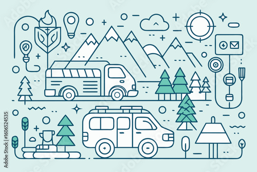 Векторная иллюстрация концепции заправки топливом. Современный элемент дизайна в плоском стиле thin line art в форме автомобиля с символами солнечной зарядки и заправки бензином, значками для баннеров веб-сайтов и печатных материалов