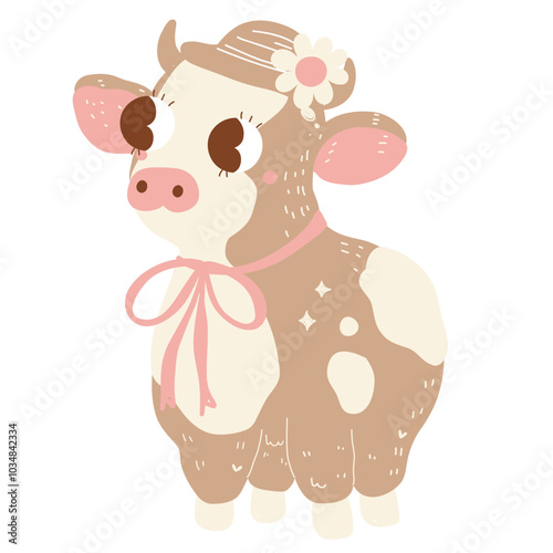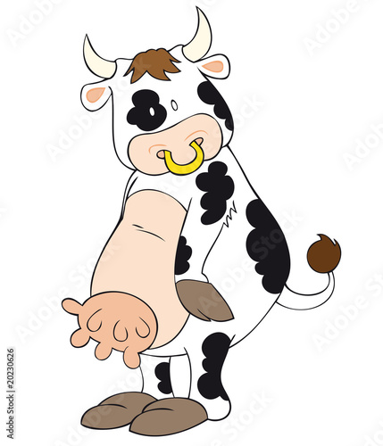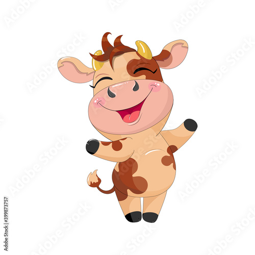 Забавная мультяшная корова с векторным стеклом для молока. Счастливая улыбка пятнистого рогатого сельскохозяйственного животного, приветствующего свежую молочную смесь, изолированную на белом фоне