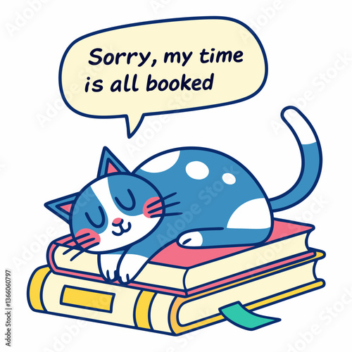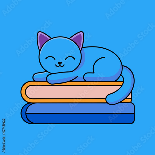 Забавный вектор животных-кошек. Ленивый котенок спит на иконке стопки книг. Милый персонаж дремлет на иллюстрации стопки учебников, изолированной на белом фоне