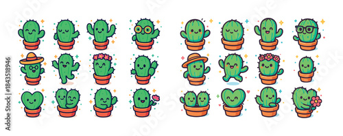 Забавная векторная мультяшная иллюстрация персонажа кактуса. Кавайные кактусы в горшке и набор натуральных цветов. Милый улыбающийся смайлик, изолированный на белом фоне. Комнатное растение с колючими цветами и дикорастущий суккулент