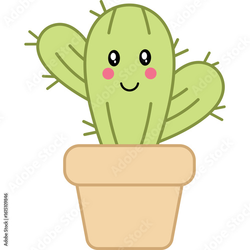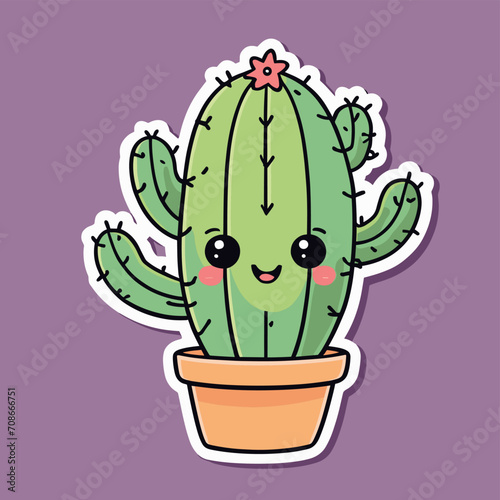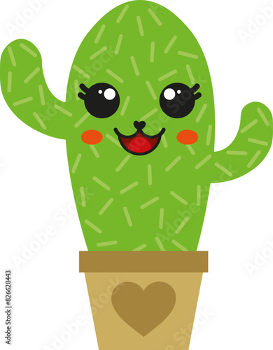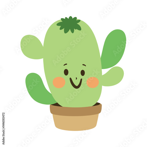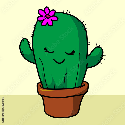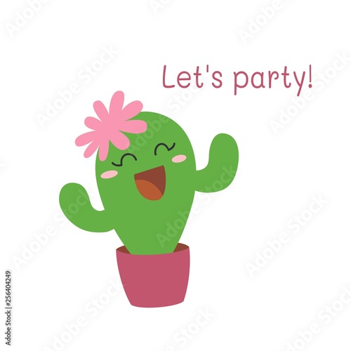 Вектор кактуса. Забавный талисман растения-суккулента в виде девушки с мультяшной иллюстрацией розового цветка. Милые кактусы кокетливо улыбаются в цветочном горшке, выделенном на белом фоне