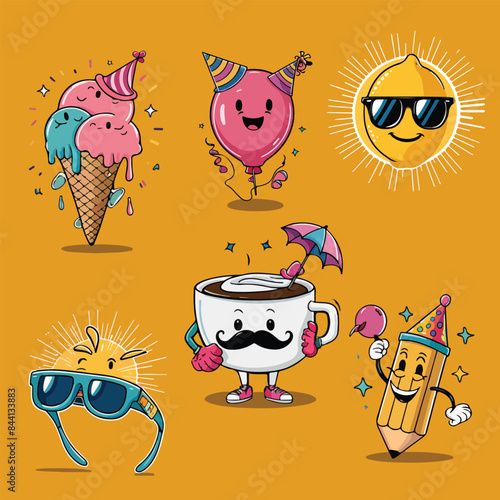 Забавный набор плоских векторных лиц для тропического коктейля. Симпатичная иллюстрация кавайного мультяшного персонажа из коктейля "пина колада", "кокос", "грейпфрут". Смайлик с экзотическими напитками, выделенный на белом фоне