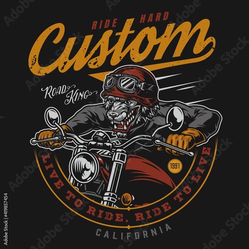 Разъяренный русский медведь с демоническими глазами. Шапка-ушанка, бутылка водки, балалайка. Графический векторный логотип в мультяшном стиле.