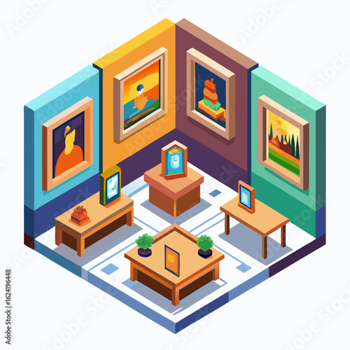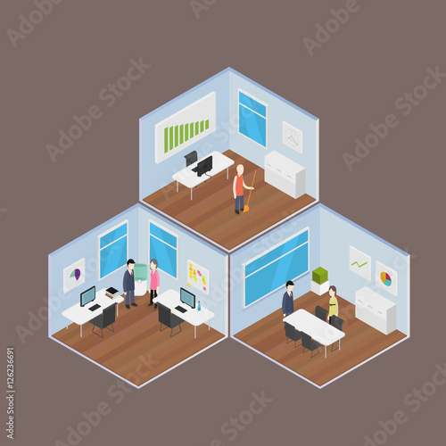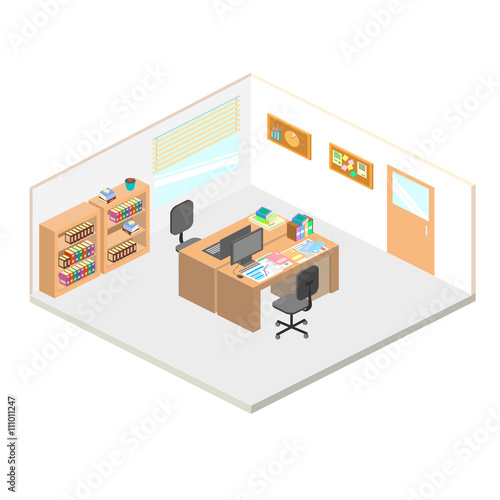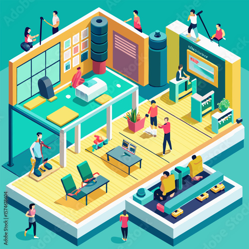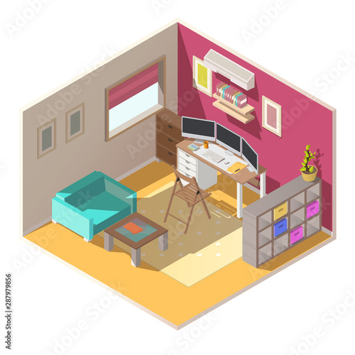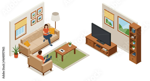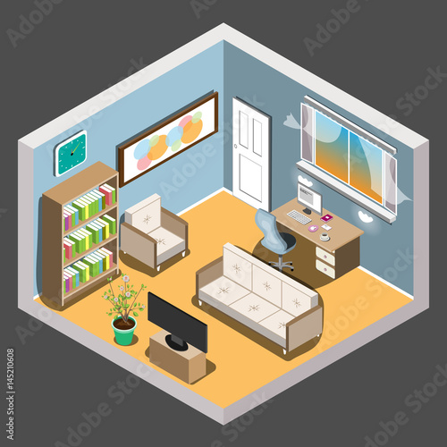 Концепция услуги по установке мебели. Векторный изометрический вырез интерьера гостиной с рабочим-плотником, устанавливающим деревянный шкаф с двумя выдвижными ящиками.