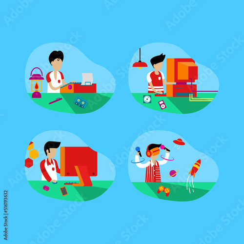 Сцена создания игры. Набор векторов для анимации и моушн-дизайна, программирования и тестирования программного обеспечения. Иллюстрация персонажа-дизайнера и программиста, работающего над разработкой компьютерной игровой платформы