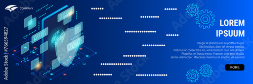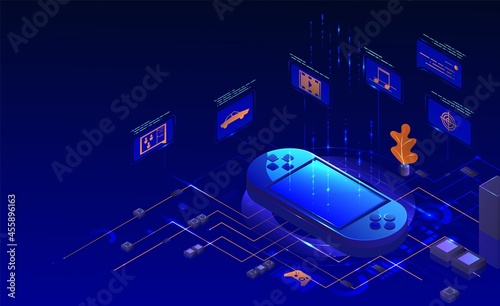 Шаблон веб-баннера игровых гаджетов. Оборудование для геймеров, включая консоль, контроллер, компьютер, векторную изометрическую иллюстрацию. Онлайн-игры и игры на игровых приставках.
