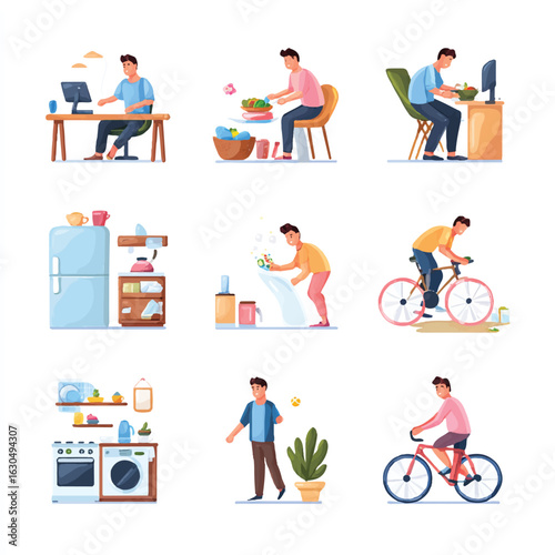 Набор для гаражных распродаж, плоская векторная изолированная иллюстрация. Люди покупают подержанную домашнюю мебель, бытовую технику, одежду, музыкальные инструменты, книги, посуду, спортивные принадлежности. Дворовая распродажа, блошиный рынок.