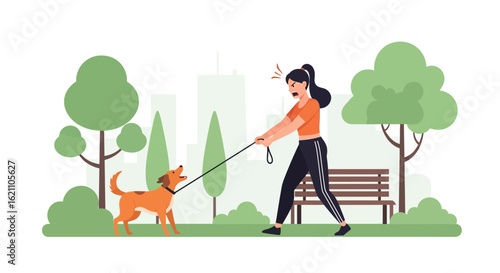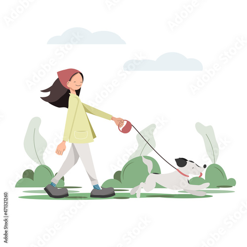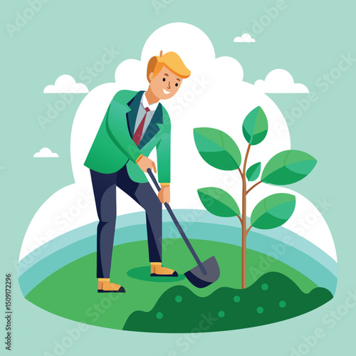 Садовник косит газон газонокосилкой. Стрижка травы, стрижка двора, садоводство. Векторная иллюстрация в плоском дизайне.
