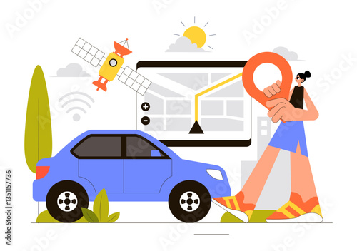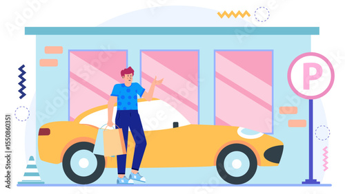 Векторная концепция газовой и нефтяной станции для веб-баннера, страницы веб-сайта с красным автомобилем, рабочими и водителем с кредитной картой.