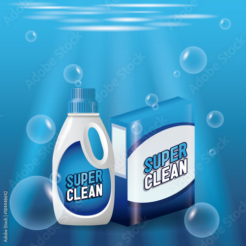 Векторная иллюстрация рекламы гелевого стирального порошка. Шаблон дизайна этикетки для упаковки пластиковых бутылок с жидким моющим средством для стирки.