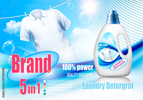Рекламный плакат гелевого стирального порошка. Векторная реалистичная иллюстрация. Шаблон дизайна этикетки для упаковки пластиковых бутылок с жидким моющим средством для стирки.