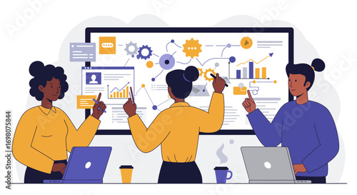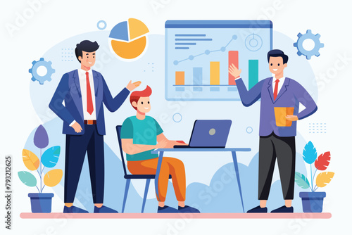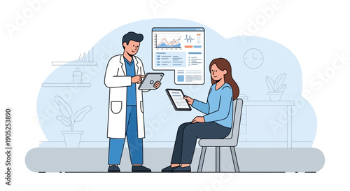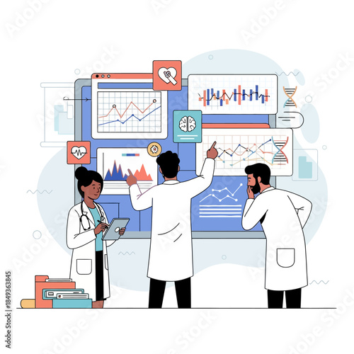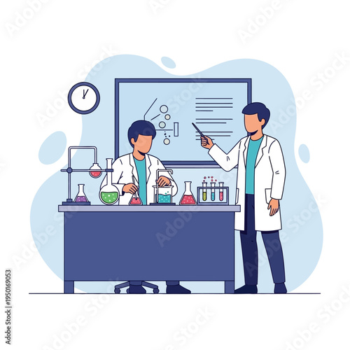 Лаборатория генетических наук. Исследователи, ученые мужские персонажи в белых халатах, изучающие днк с помощью лабораторного оборудования, плоская векторная иллюстрация. Биотехнология, генная инженерия, наука и образование.