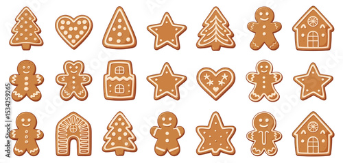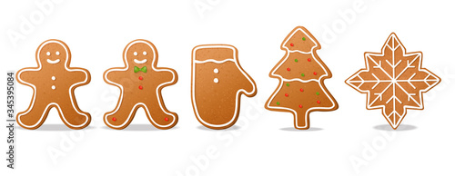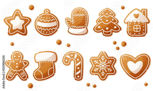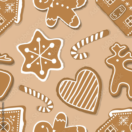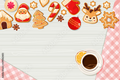 Пряничное печенье, кофейная чашка, кофейник на деревянном столе, векторная иллюстрация с видом сверху. Бисквит с имбирным хлебом, традиционное рождественское печенье.