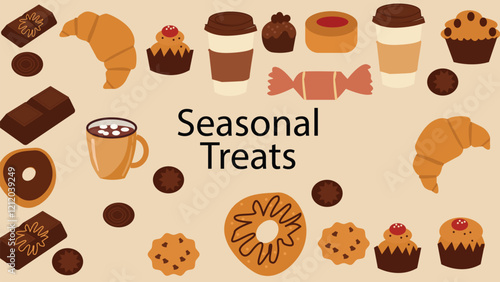 Пряничное печенье, кофейная чашка, кофейник на деревянном столе, векторная иллюстрация с видом сверху. Бисквит "Имбирный хлебец", традиционная рождественская выпечка.