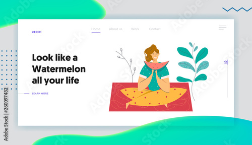 Девушка занимается медитацией и гьян мудра йогой на фоне природы. Концепция человеческого просвещения. Тонкая энергия, жизненный баланс. Векторный шаблон дизайна веб-сайта. Иллюстрация веб-сайта целевой страницы