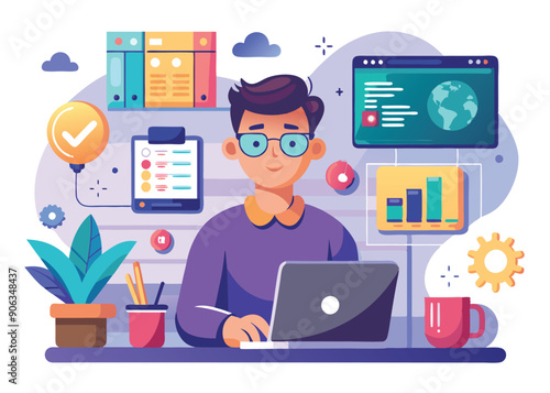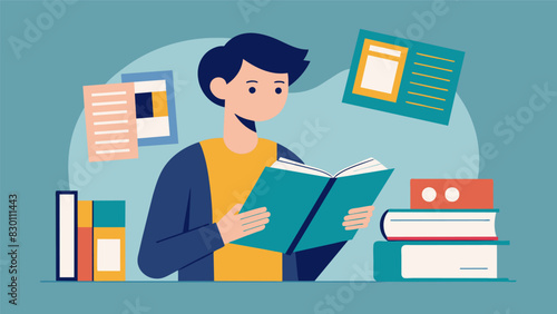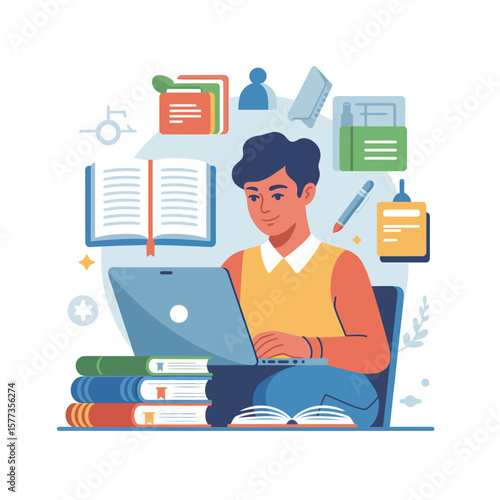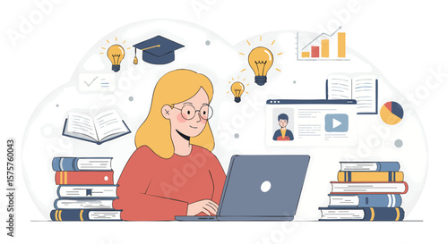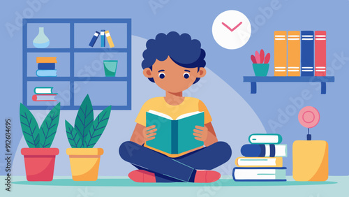 Девушка читает книгу дома, плоская векторная иллюстрация. Молодая женщина, студентка, изучающая психологию, сидит в позе лотоса, окруженная стопками книг. Изучение психического здоровья. Знания и образование.