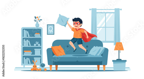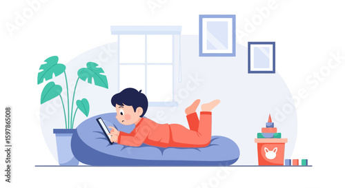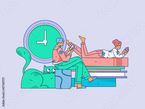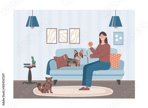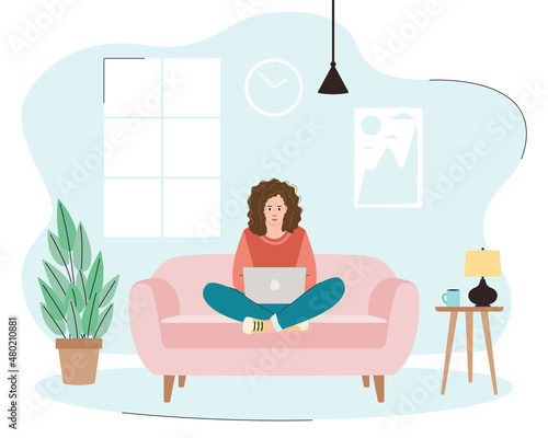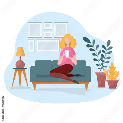 Девушка читает книгу, сидя в кресле в уютной гостиной, плоская векторная иллюстрация. Молодая женщина учится, отдыхает дома, наслаждается чтением в свободное время. Хобби и досуг, образование.