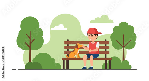 Девушка читает книгу, сидя на скамейке в городском парке, плоская векторная иллюстрация. Счастливая женщина наслаждается свободным временем, гуляя с собакой, отдыхая и читая любимый журнал. Хобби и досуг, образование.