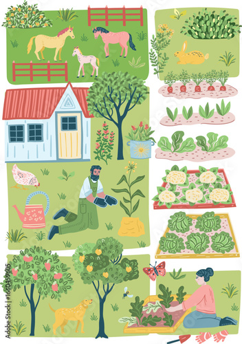 Девушка едет на велосипеде по сельской дороге. Открытый природный ландшафт и сельская ферма. Девушка со свежими цветами. Векторный шаблон дизайна веб-сайта плакат.