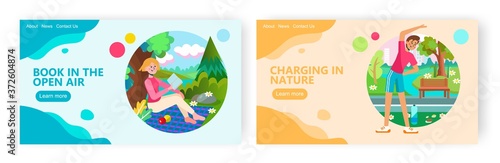Девушка остается на улице и читает книгу. Растяжка мужчины упражняется в парке. Иллюстрация концепции досуга. Векторный шаблон дизайна веб-сайта.