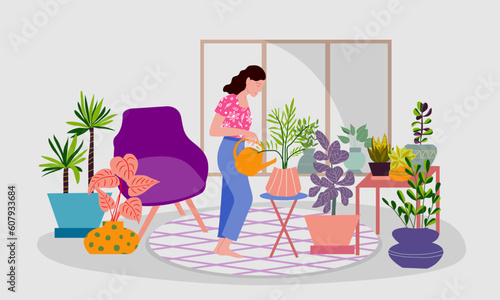 Девушка ухаживает за комнатными растениями, растущими в горшках. Иллюстрация концепции комнатных растений и домашнего сада. Векторный шаблон дизайна веб-сайта. Интерьер с кактусами и зелеными растениями.