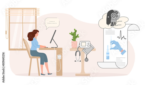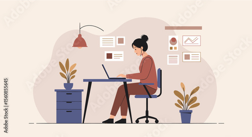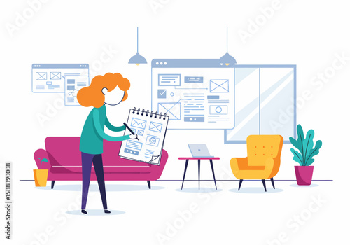Девушка завязывает новую одежду перед зеркалом векторная иллюстрация. Молодая женщина - плоский мультяшный персонаж. Леди выбирает модную ткань, девушка-покупательница в новом образе. Интерьер комнаты ателье модной студии