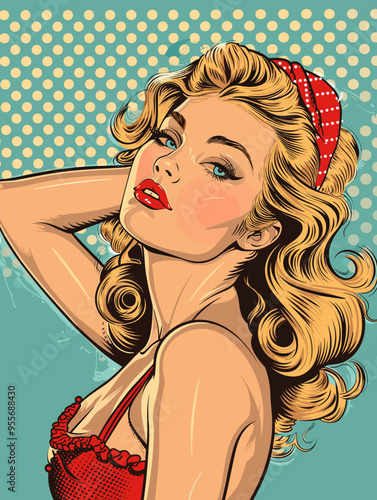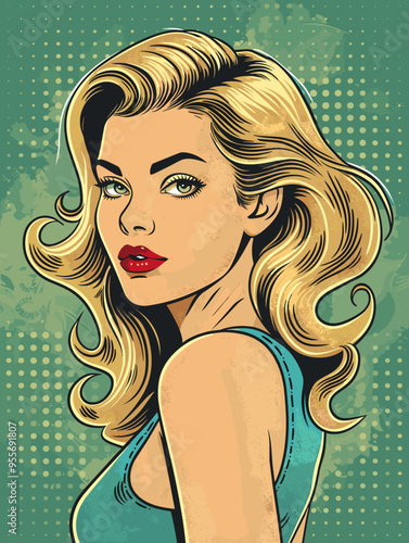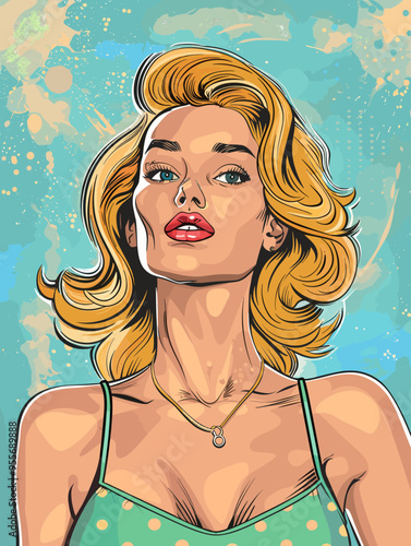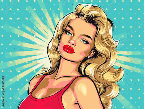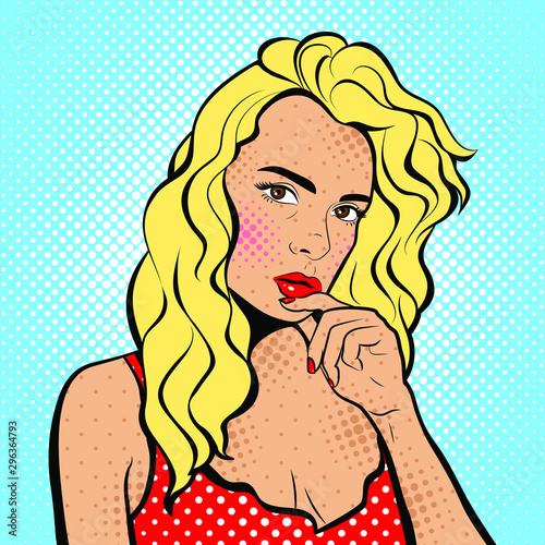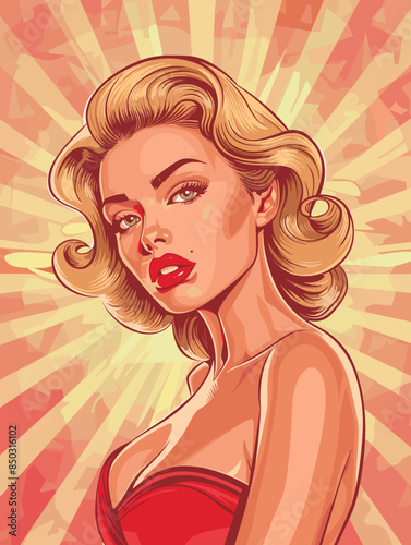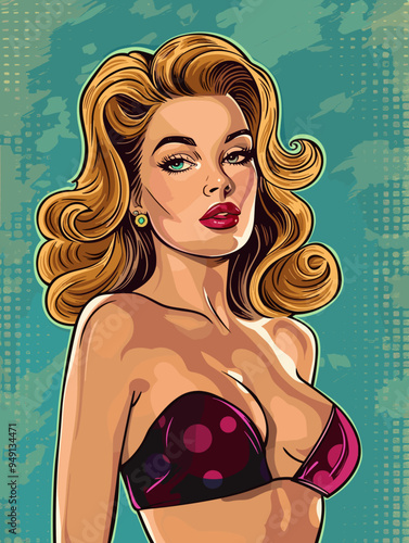 Векторная иллюстрация красивой сексуальной девушки с длинными волосами. Портрет гламурной женщины в стиле комиксов ретро-поп-арта.