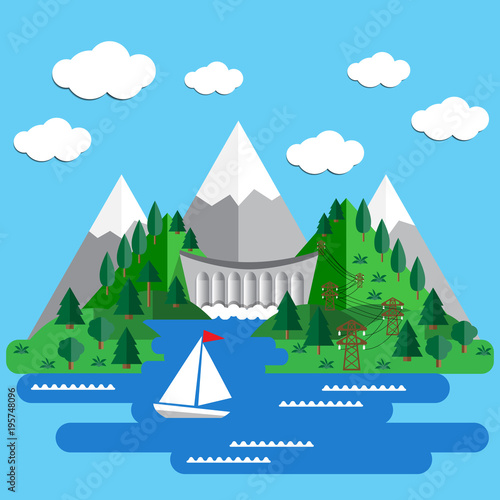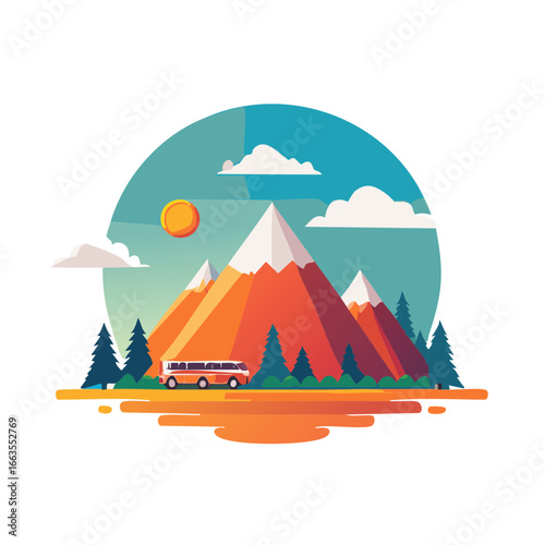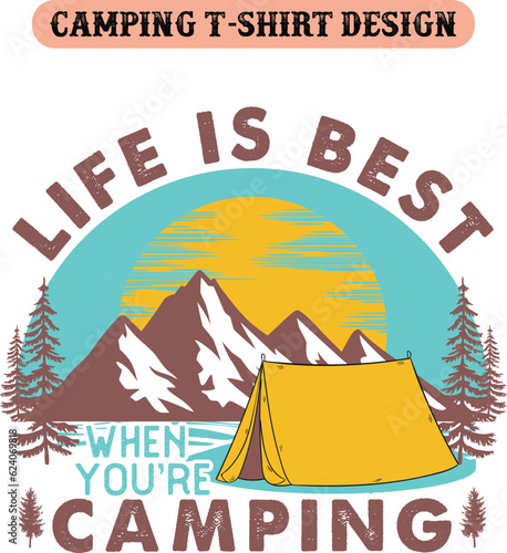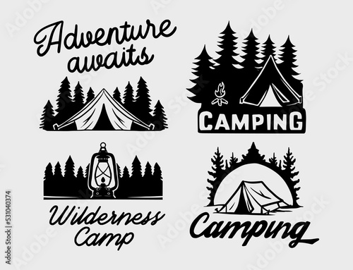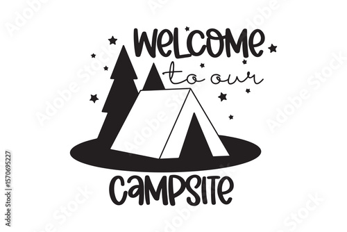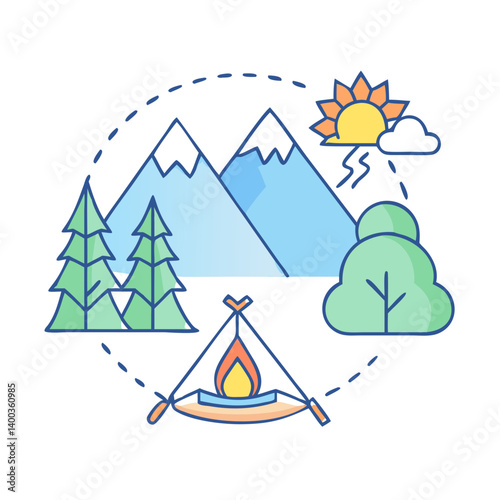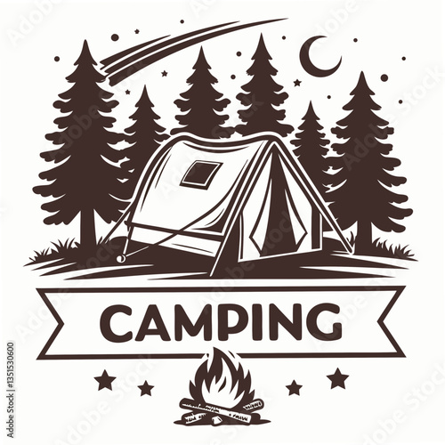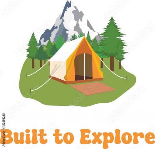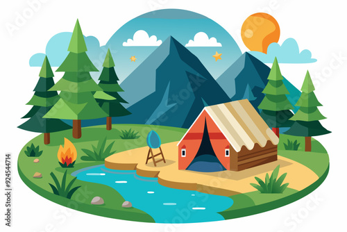 Гламурная реклама. Векторный плакат эко-лагеря. Современный юрточный кемпинг, расположенный в лесу и горах. Концепция путешествий, отдыха и приключений на природе. Палаточный домик, костер на фоне природного ландшафта