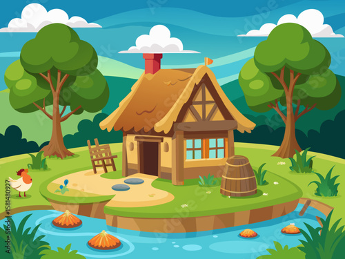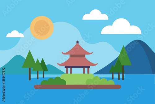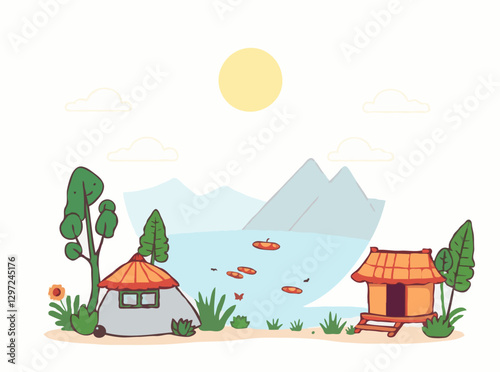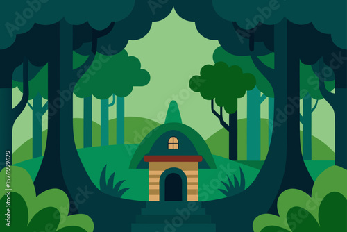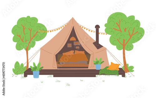 Глэмпинг. Вектор роскошной палатки. Домик для кемпинга в лесной иллюстрации. Плакат о путешествиях, поездке на природу или приключениях. Пикник на открытом воздухе за городом. Романтический туризм на отдыхе