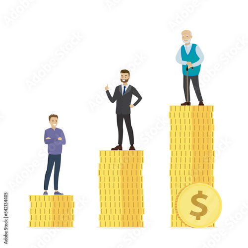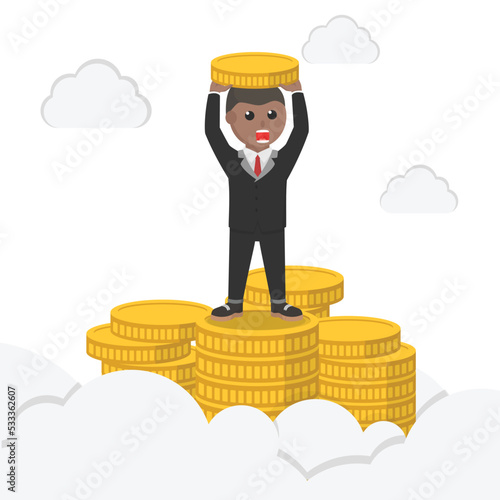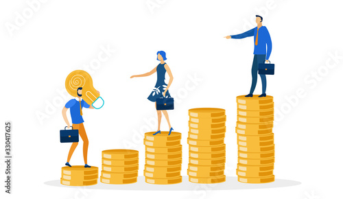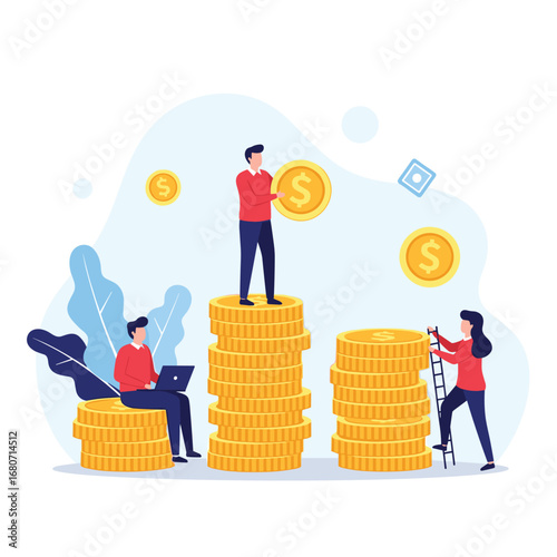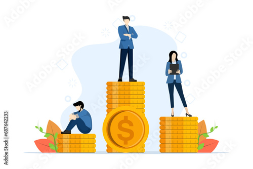 Бизнес-команда празднует победу. Лучший сотрудник на вершине пьедестала почета с кучей монет, держащий кубок за трофей, плоская векторная иллюстрация. Достижение цели, карьерный рост, финансовый успех.