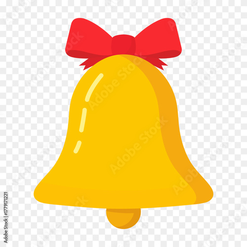 Золотой колокольчик с красным бантом для празднования Рождества и Нового года векторная иконка, изолированная на белом фоне.