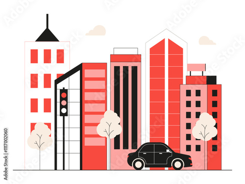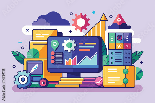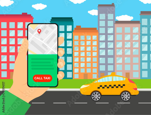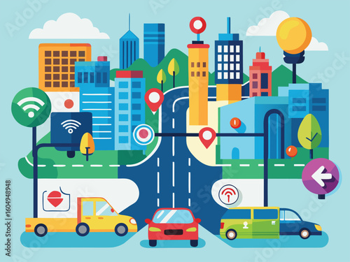 Векторная иллюстрация большого мобильного телефона с картой и указанием местоположения на экране, крошечные люди используют ноутбук, смартфон, чтобы найти нужное им место. Концепция GPS-карты и навигационных приложений для веб-баннера, веб-страницы.