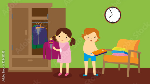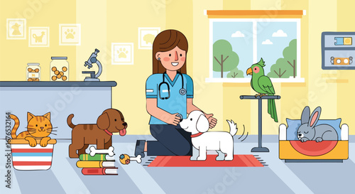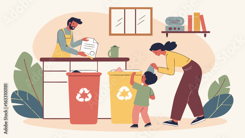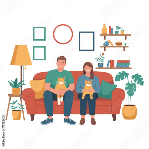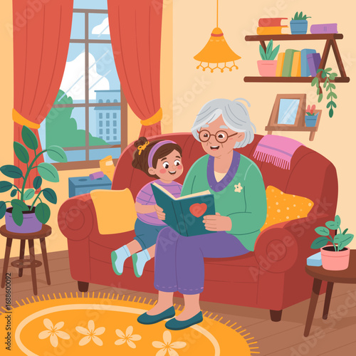 Векторная иллюстрация дедушки и внука, читающих книгу вместе, сидя на диване, и домашней собаки, лежащей на ковре в гостиной. Дизайн в плоском стиле.
