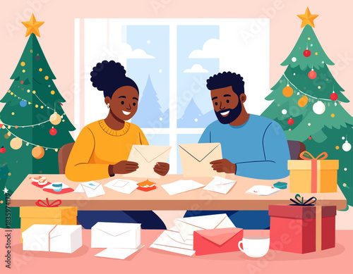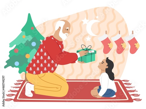 Дедушка дарит рождественский подарок внучке, плоская векторная иллюстрация. Счастливые дедушка и внучка вместе празднуют рождественские каникулы. Отношения между бабушкой, дедушкой и внуками.