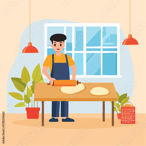 Внук помогает своей бабушке по хозяйству, плоская векторная иллюстрация. Счастливые бабушка и внук проводят время вместе, занимаясь домашними делами. Отношения между бабушкой, дедушкой и внуками.