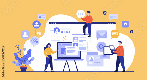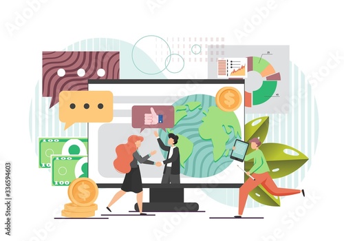 Деловые люди заключают сделку с помощью планшета и настольного компьютера, векторная плоская иллюстрация. Цифровое деловое соглашение, выгодная сделка, онлайн-общение, поднятый вверх большой палец для одобрения.