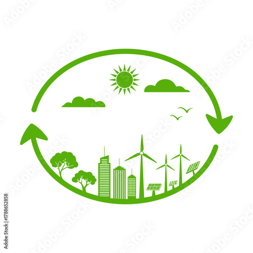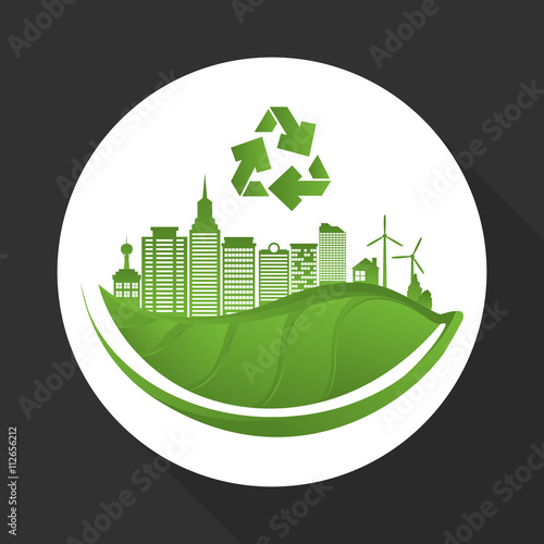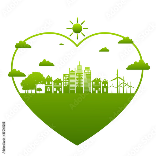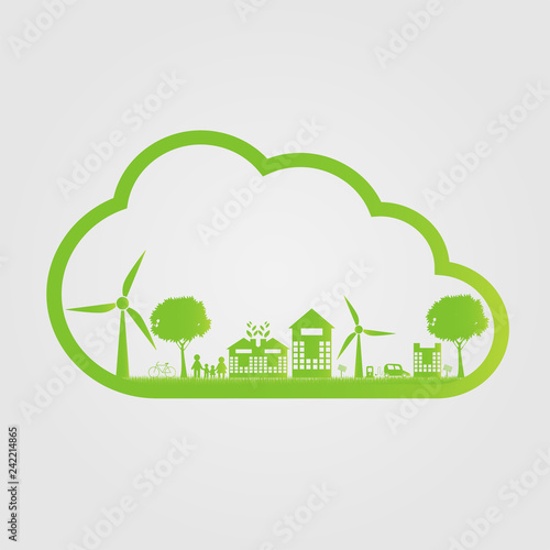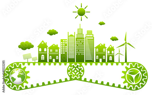 Вектор эко-энергии зеленого города. Окружающая среда и экология спасают иллюстрацию. Фон городского здания с городским пейзажем и штепсельная вилка в вырезанном из бумаги дизайне в стиле арт-крафта