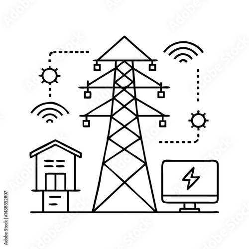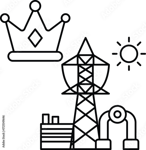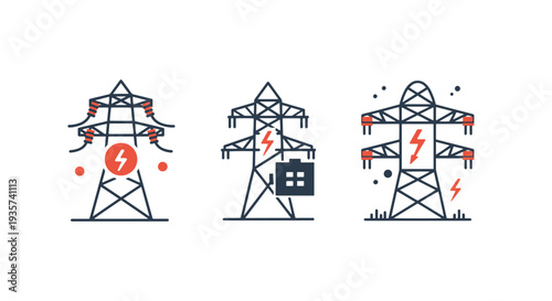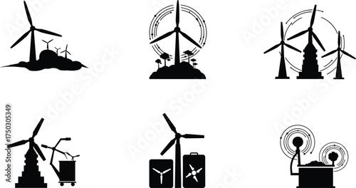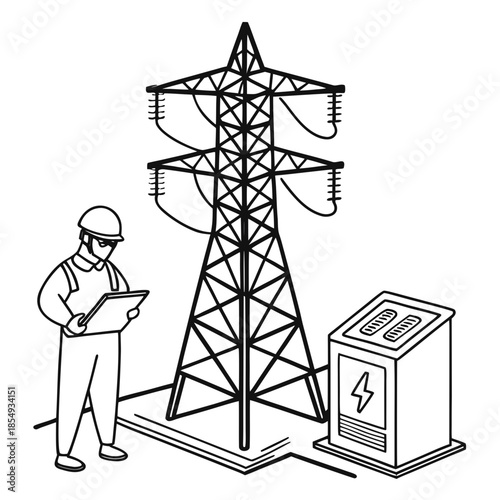 Векторная иллюстрация высоковольтных линий электропередачи, ветряных турбин, рабочих, держащих солнечную панель, батарею, завод. Зеленые источники энергии, концепция производства электроэнергии из возобновляемых источников для веб-страницы веб-баннера.